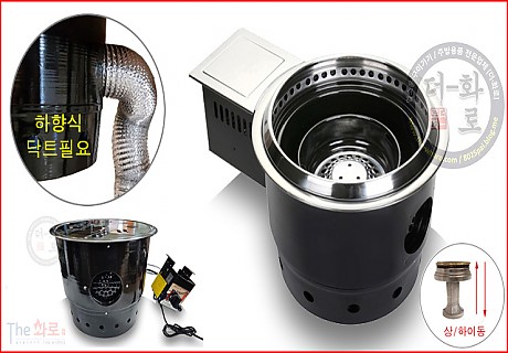 ◑ 스위치를 누르면 버너가 아래/위로 전동 이동이 가능하여 삼발이 사용시 탕, 전골 요리도 가능 합니다. ( 탕 요리시 숯통은 제거하고 삼발이를 올려 이용) ◑ 연기 배기시설은 바닥에서 시공하는 하향식 닥트시설이 필요. ◑ 연기 배기시설은 바닥에서 시공하는 하향식 닥트시설이 필요. |